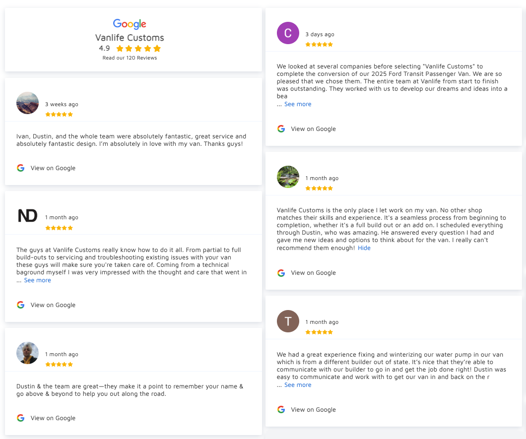 Real Google reviews from people who trusted us with their custom van build and the journey that followed.