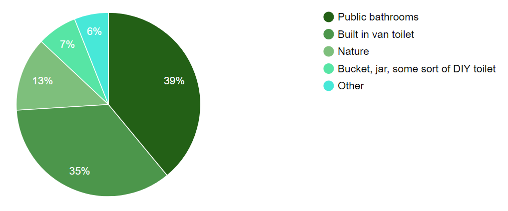 Another interesting bathing statistic showed that only 13% of European respondents bathe at a gym, compared to 28% of all respondents. European van lifers rarely bathe at gyms because there are few gym franchises in Europe that have thousands of locations with 24 hour access. In the U.S. in particular, there are really affordable gyms like Planet Fitness with locations all over the country. This makes it easy to stop in for a quick rinse.