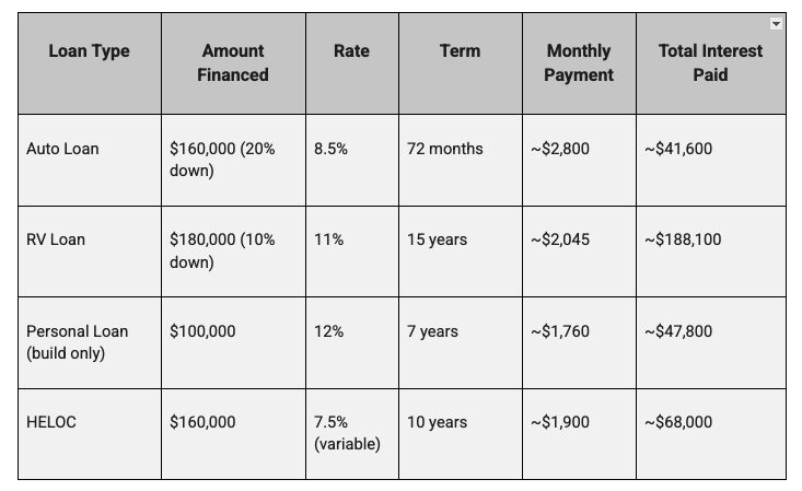 The pitfall: Go back to that interest table above. A 15-year RV loan at 10–11% APR on a $200,000 van means you're paying six figures in interest over the life of the loan. You're also making payments during the build, typically 4–6 months before you ever take delivery of the finished van. And geographic restrictions apply; Umpqua's program, for example, is currently limited to Oregon, Washington, California, Idaho, and Nevada.