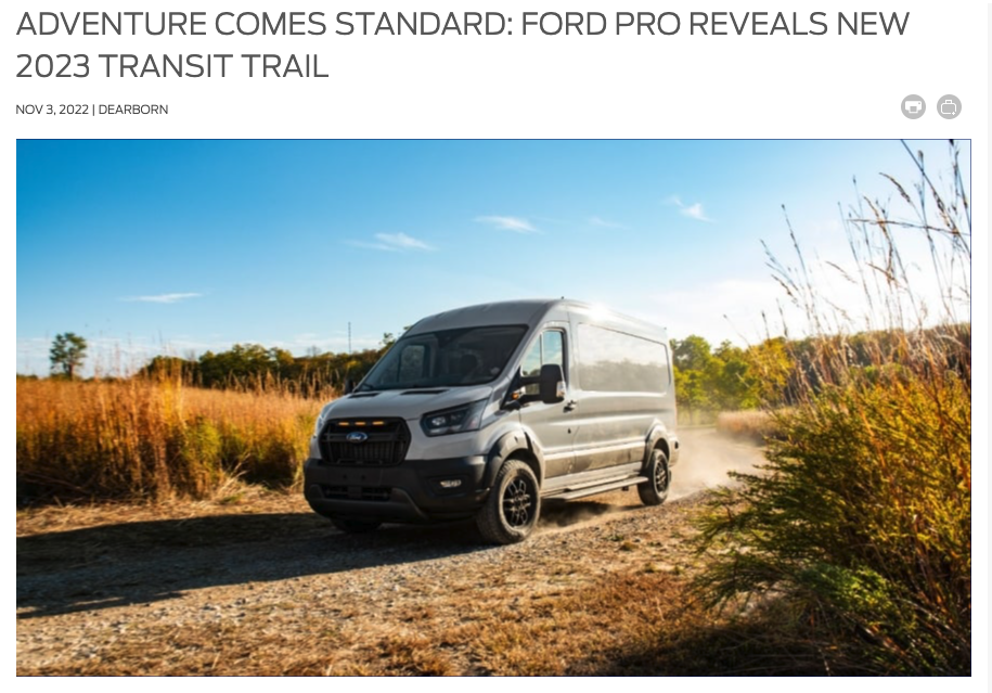A factory 3.5” lift kit, aggressive body panel protection, and all terrain tires and wheels are just a few items on the list that make the Transit Trail the perfect chassis for your custom adventure rig.